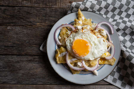 Chilaquiles, traditional Mexican breakfast. Copy space