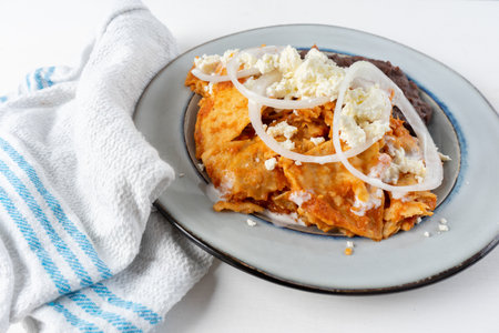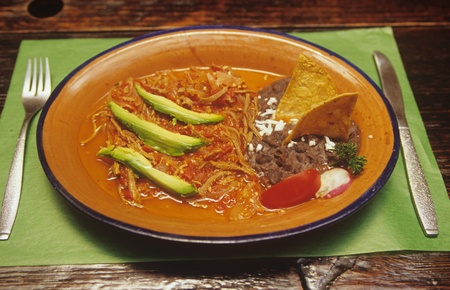 Mexican food: Red chilaquiles with cheese and beans