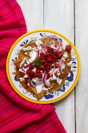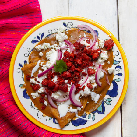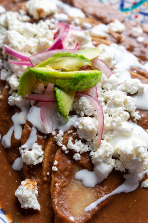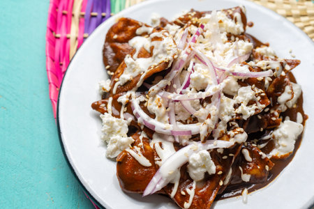 Traditional mexican chilaquiles with mole sauce and fresh cheese on turquoise background