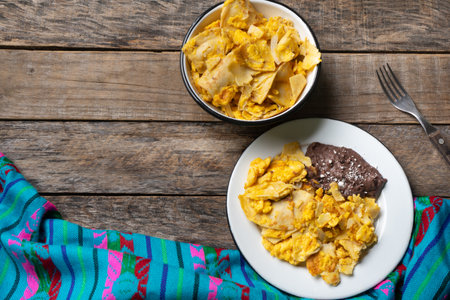 Traditional mexican scrambled eggs with corn tortilla also called migas on wooden background