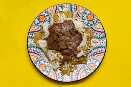 Traditional mexican green chilaquiles with cecina beef steak on yellow background