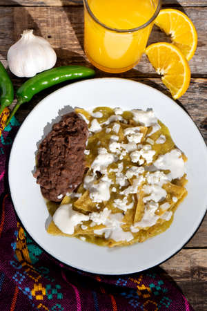 Green chilaquiles with refried beans and cheese on wooden background. Traditional mexican food