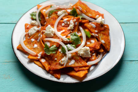 Traditional mexican food. Red chilaquiles with cheese and sour cream on turquoise background