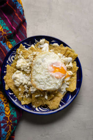 Traditional mexican food. Green chilaquiles with cheese and fried egg on gray background