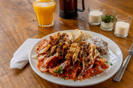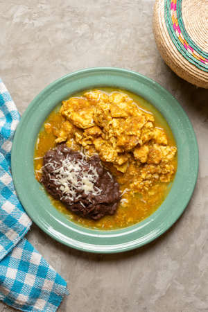 Scrambled eggs with red sauce and beans. traditional mexican food