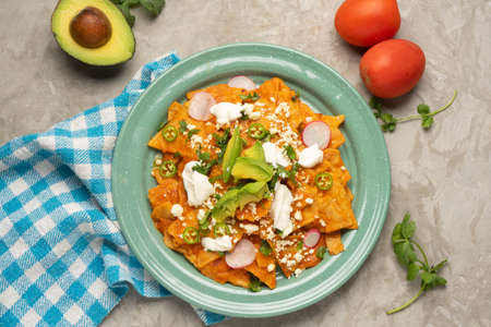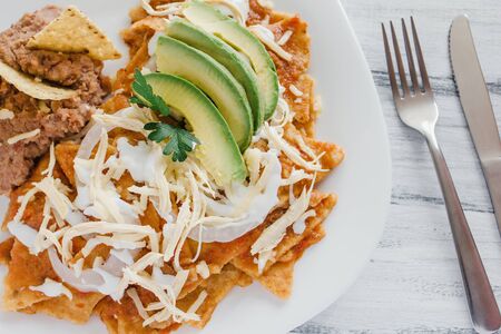 Red chilaquiles with cheese and avocado. traditional mexican food