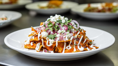 Professional plating of traditional chilaquiles topped with precise lines of Mexican crema, crumbled queso fresco, diced red onions, and fresh cilantro on a white ceramic plate.