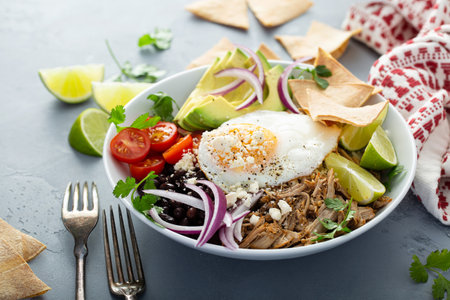 Breakfast burrito bowl with pork carnitas, tomato, beans and rice