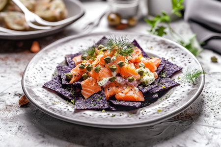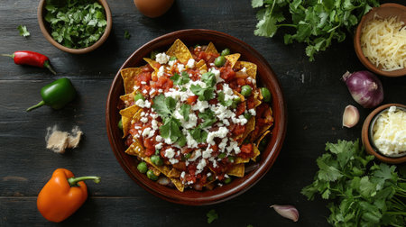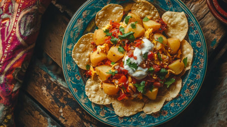 A vibrant plate of nachos topped with fresh vegetables, creamy sauce, and herbs, artfully arranged on a rustic wooden surface, perfect for gatherings.