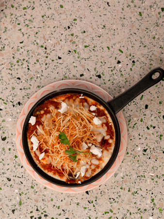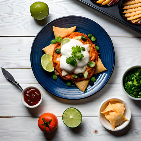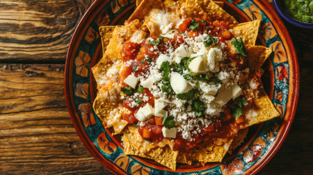 A delicious plate of Mexican chilaquiles with salsa, cheese, and fresh toppings, viewed from above