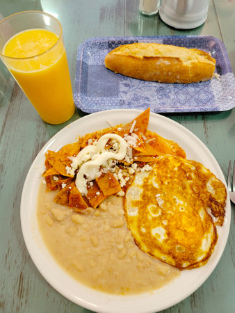Chilaquiles and Refried Beans, Traditional Mexican Breakfast