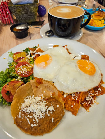 Delicious Mexican chilaquiles, topped with two fried eggs, refried beans, and a fresh salad. Ideal for a savory breakfast or brunch