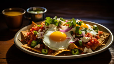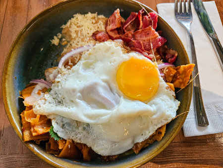Plate of classic Mexican chilaquiles with sunny-side up egg, crispy bacon, cheese, red onion. Delicious breakfast on a wooden table