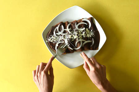 Overhead shot of young Latina woman starting enfrijoladas, yellow background and copy space