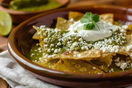 mexican green chilaquiles with chicken and spicy green sauce traditional breakfast in Mexico