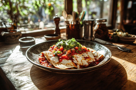 Delicious Enchiladas with Fresh Salsa and Cheese on a Rustic Table, Evoking Mexican Tradition