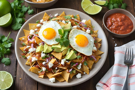 close-up of homemade chilaquiles with a fried egg, ham, crumbled panela cheese, avocado and tomato salsa on a white plate, Mexican dish, view from above