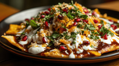 A vibrant and flavorful dish showcasing layers of nachos topped with creamy sauce, fresh herbs, pomegranate, and colorful ingredients perfect for sharing.