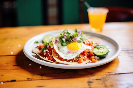 Mexican traditional chilaquiles breakfast Green red salsa Orange juice wooden