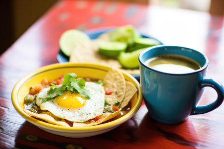 green chilaquiles with avocado, and a cup of Mexican coffee. traditional mexican food