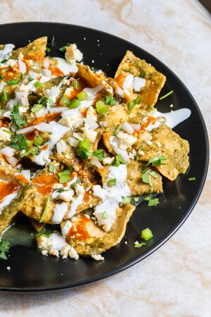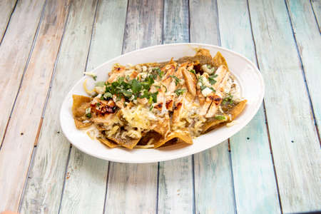 Mexican chilaquiles with chicken and spicy green sauce traditional breakfast in Mexico. horizontal top view