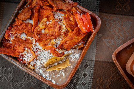 delicious red chilaquiles, beans and red pork chicharron, traditional mexican dish.