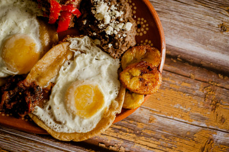 Huevos rancheros, meat, beans, and fried plantains in a clay dish. Typical Mexican food.