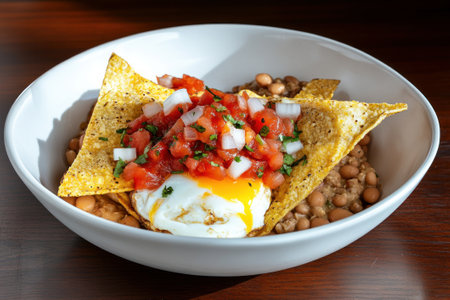 Delicious bowl of nachos topped with fresh salsa and a perfectly poached egg on a wooden table.