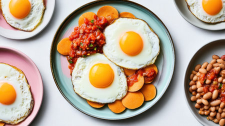 Delicious fried eggs topped with fresh salsa, complemented by sweet potatoes and beans on stylish plates.