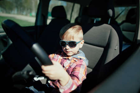 Cute little boy driving fathers car. Portrait of a child sitting in a car behind the wheel from the front. The boy plays and imagines he is driving, he controls the radio with the other hand.