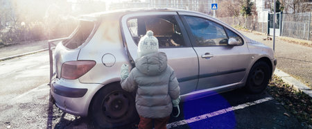 A child in a warm coat and hat standing near a damaged and abandoned silver car, set in an outdoor urban area with sunlight in France