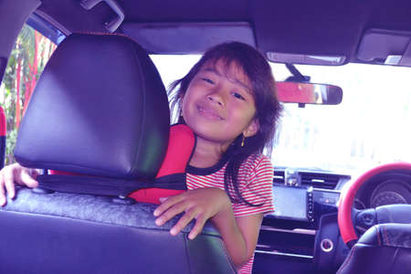 Asian girl looks back while in the car before the vacation trip