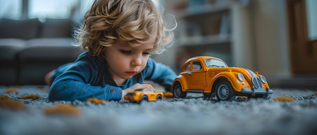 A young boy playing with a toy car on the ground, AI