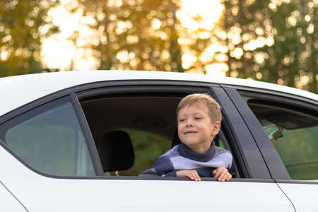 A seven year old cute boy leans out the window of a white car on a warm sunny autumn day against the backdrop of yellow foliage. Selective focus. Portrait