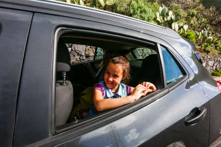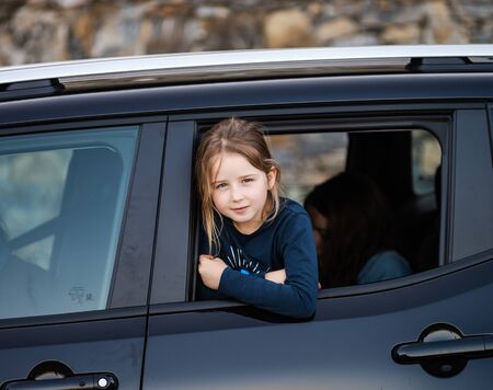 Pretty little girl in the car looking through car window. Travel concept.