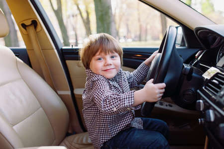 little cute boy driving fathers car at springtime
