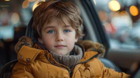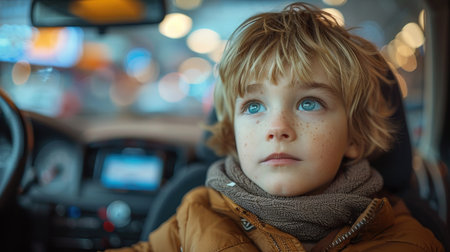 Generative AI : Portrait of a little smiling blond boy in the car