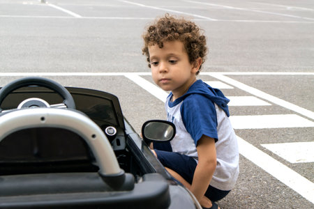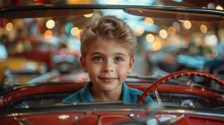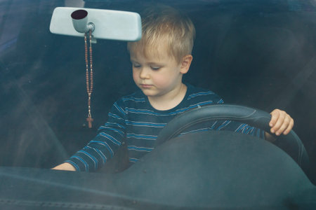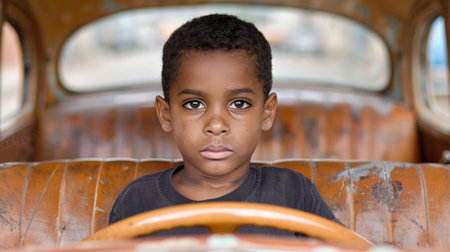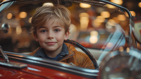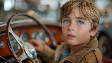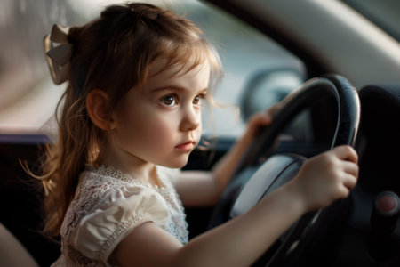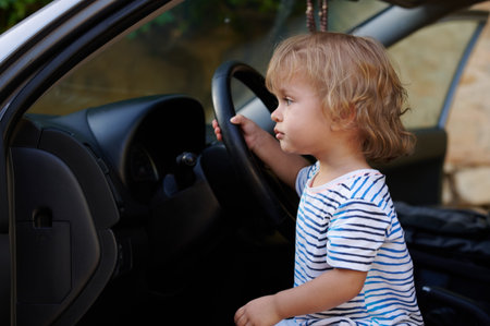 Young child eagerly engaging with a car's steering wheel, evoking themes of curiosity, playfulness, and growing up. The enchanting scene captures the innocence of childhood exploration and fun.