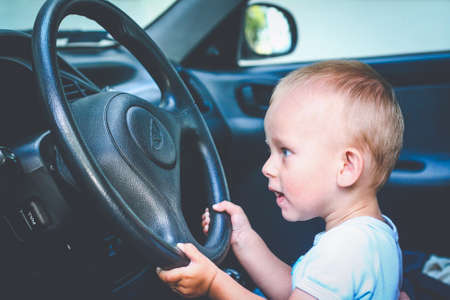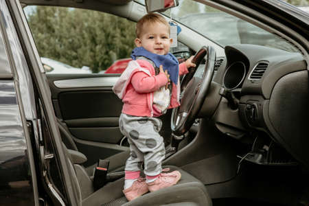 Little kid in a car. Stands in the driver's seat and holds the wheel. The car door is open. Infant driving. The kid looks thoughtfully out of the car with the right-hand drive.