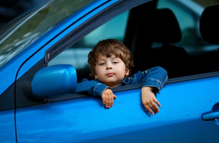 Baby boy in the car looking throw window.