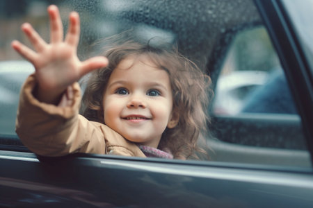 A young girl happily waves farewell from the car window, filled with vacation memories.