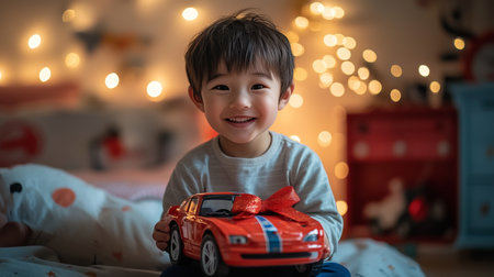 Happy Boy Smiles While Holding Gift Car In Bedroom Decorated With String Lights On Christmas Holiday