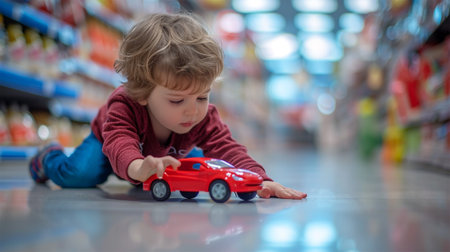 A young child plays with a toy car on a grocery store floor, a moment of innocence and simplicity.