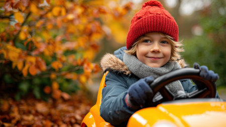 A young boy in a red hat and gray scarf smiles while driving a bright orange toy car. Surrounding him are vibrant orange and yellow autumn leaves creating a cheerful scene.