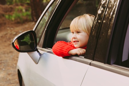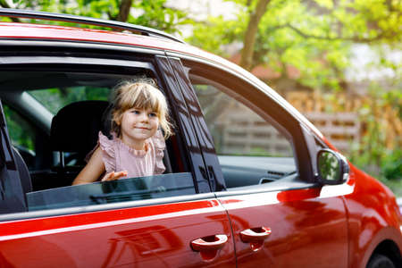 Happy child, preschool toddler girl sitting in car before leaving for summer vacation with parents. Happy kid by window of car going on journey, family road trip