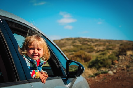 happy little girl travel by car in nature