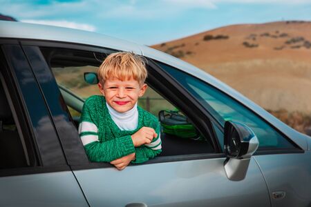 happy little boy travel by car in mountains