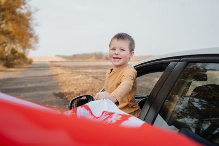A little boy in a brown sweater is smiling and holding the flag of Poland in his hand. A child looks out of the car, waving a flag. Concept of national holidays and patriotic events. Patriotism.