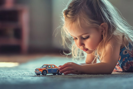 A young girl is seated on a floor at home, engrossed in playing with a small toy car. Generative AI