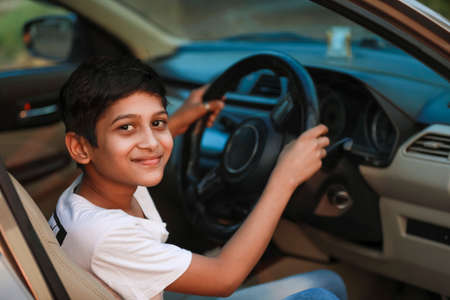 Child kid driver. Child boy driving car as driver. Baby kid sitting in seat.